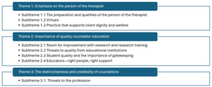 From the study’s dataset, three themes and eight subthemes were identified, as presented in Figure 1. The counselling educators’ answers fluctuated between, on the one hand, their teaching values and perceptions and, on the other, those they perceived to relate to the profession. These aspects were logically intertwined given they were preparing the next generation of counsellors for entry into the profession. The counselling educators’ transcripts quoted in this article are labelled according to their primary identity related to their therapeutic work and the order of the interview. For instance, the first interviewed identified as a psychotherapist so the identity is given as Psychotherapist 1.