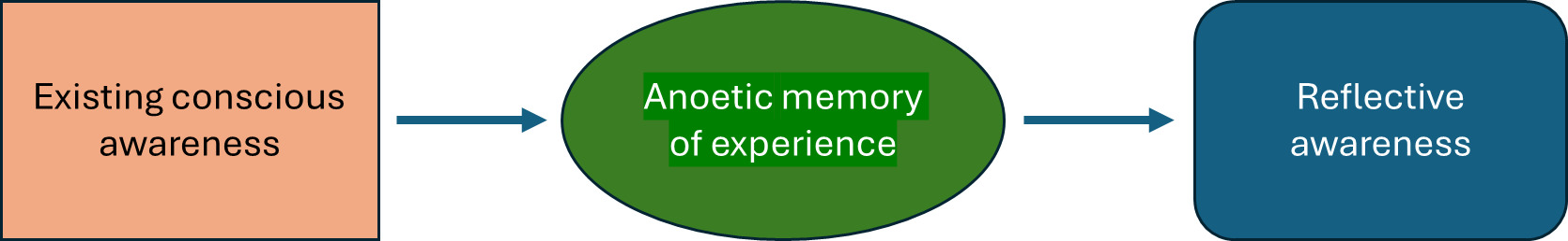 The client’s inner world is only partially known by them since a good portion of life is non-conscious. As explained earlier in the discussion of play, much of human memory is anoetic and only connects with conscious awareness in what might be experienced as nuomenal moments. While therapy cannot produce such moments of awareness, it can provide the opportunity for their appearance. One of the most facilitative ways of allowing for such a possibility is through attending to symbols and metaphors. When a therapist listens intently to a client’s feeling and somatic states and their use of symbols and metaphors, surprising connections and insights are presented (Faranda, 2016; D. J. O’Hara & O’Hara, 2020). In terms of the process of therapy, this might be regarded as a movement from existing cognitive awareness towards the possibility of anoetic nuomenal (non-abstract, transcendental) upwellings, thereby leading to a new level of reflective awareness, as represented in Figure 2.