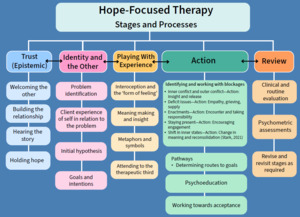 Central to the theoretical framework of hope-focused therapy is the view that hope itself is a central driver of human development. This is consistent with the views of Erikson (1950) and others (Bryce & Fraser, 2023; Trzebiński & Zięba, 2004) that the early development of hope provides the foundation upon which the satisfaction of needs, such as those proposed by Deci and Ryan (2000), rest. Without a foundation of hope, the motivation for developing agency, competence, and relationships is, to varying degrees, thwarted. Given this perspective, hope is understood to be a central factor within therapeutic change. The place of hope may vary depending on the presenting problem and the stage of therapy, but its relevance to wellbeing remains central. In the early stages of therapy, the client’s experience of hope is often quite limited. In later stages, hope is progressively recovered, enlivening the movement towards wellbeing. Hope then can be viewed as an undergirding foundation for the development of self and a sense of personal identity.